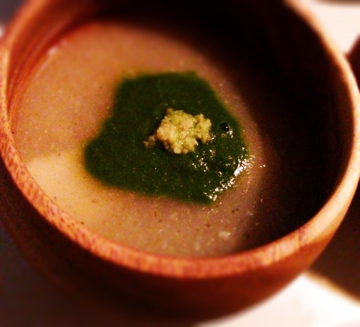 大根のスープ、里芋・菜の花のピューレにおろし生姜を添えたもの。