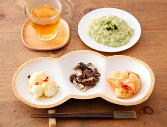 メニュー:長ネギブロッコリーのリゾット、キノコのマリネ、根菜のフリット甘酢あん、カリフラワーのガーリックオイルがけ